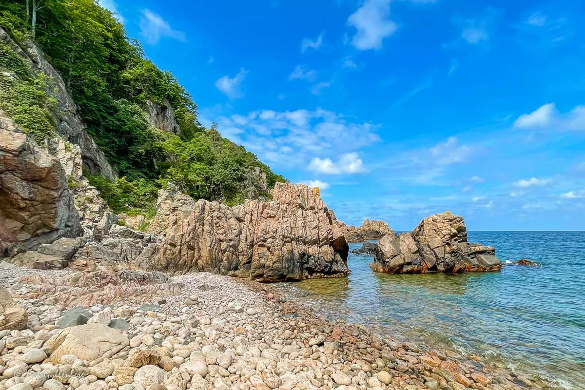 En förtrollande plats med klippor, kullerstenar och kristallklart vatten